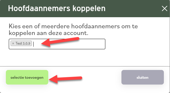 - In deze stap typ je in het vakje de naam van de organisatie en voegt hem toe door op selectie toevoegen te klikken. Het is mogelijk om tegelijkertijd verschillende organisaties toe te voegen aan het account
