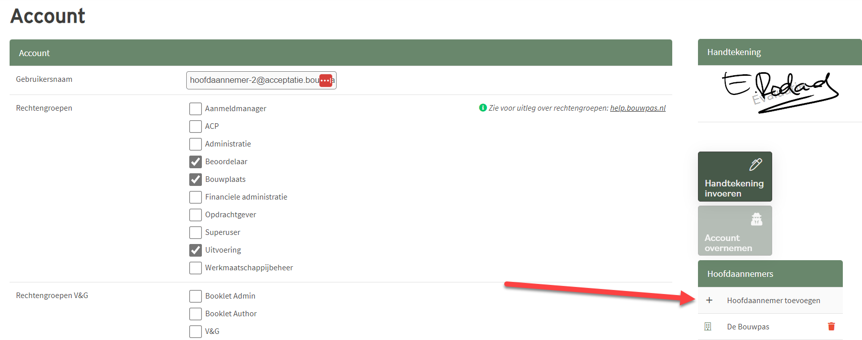 - Nadat je het account hebt aangemaakt, ga je naar het account zelf en klikt op Organisatie toevoegen (een bouwcombinatie staat ook op de lijst van Organisaties)