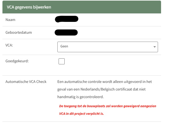 De aanmelding kan hiermee worden afgerond, óók als VCA verplicht is. Bij registratie op de bouwplaats krijgt de uitvoerder of portier een melding dat het VCA-bewijs handmatig gecontroleerd moet worden. Na controle kan de toegang alsnog worden verleend.