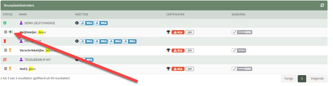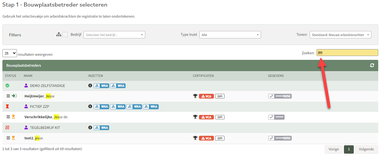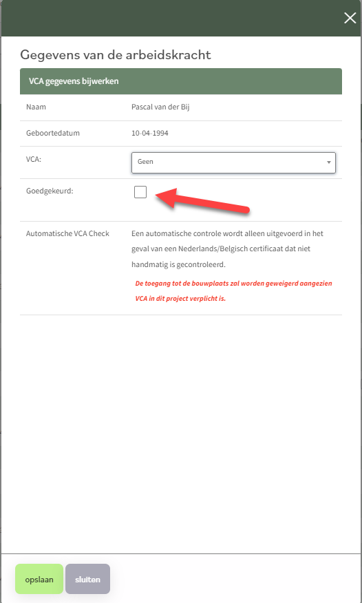 Let op: alleen arbeidskrachten die je kunt selecteren met een vinkje mag je toelaten op de bouwplaats.
