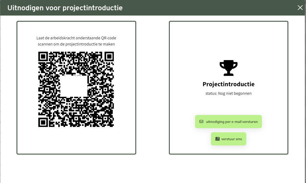 6. Laat de arbeidskracht de projectintroductie doen via de QR code (via zijn/haar telefoon laten scannen), SMS (klik op de knop) of verstuur een e-mail en sluit het scherm.