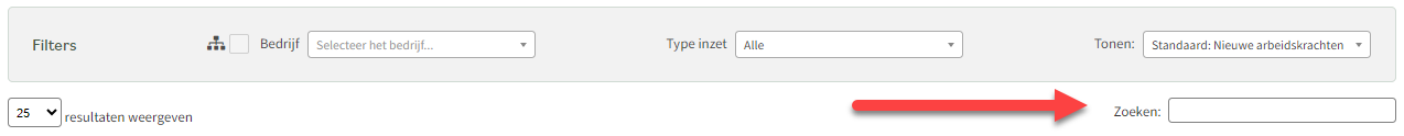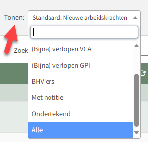Let op: De filter is automatisch ingesteld op "nieuwe arbeidskrachten" die nog aangemeld moeten worden. Bij Tonen kan je andere opties opzoeken: